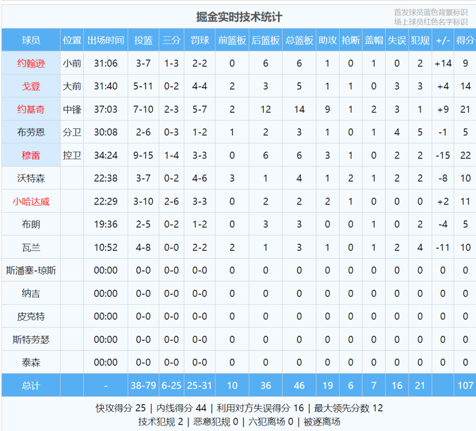 穆雷上半场10中6拿到16分4板1助,约基奇5中4得到9分8板7助。卡梅伦-约翰逊半场4中1仅得4分3板,进攻端远不如小波特。克林根5中0拿到0分11篮板,其中5个前场板。克林根虽然手感不佳,但是真能抢,这是他坐稳首发的原因。