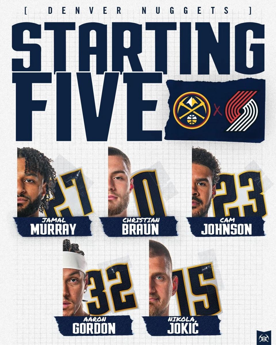 开拓者首发不变:霍勒迪、夏普、阿夫迪亚、卡马拉、克林根。掘金也是常规首发:穆雷、布劳恩、卡梅伦-约翰逊、戈登、约基奇。本赛季卡梅伦-约翰逊场均仅得8分2.5篮板1.5助攻,上赛季在篮网场均18.8分4.3篮板3.4助攻。